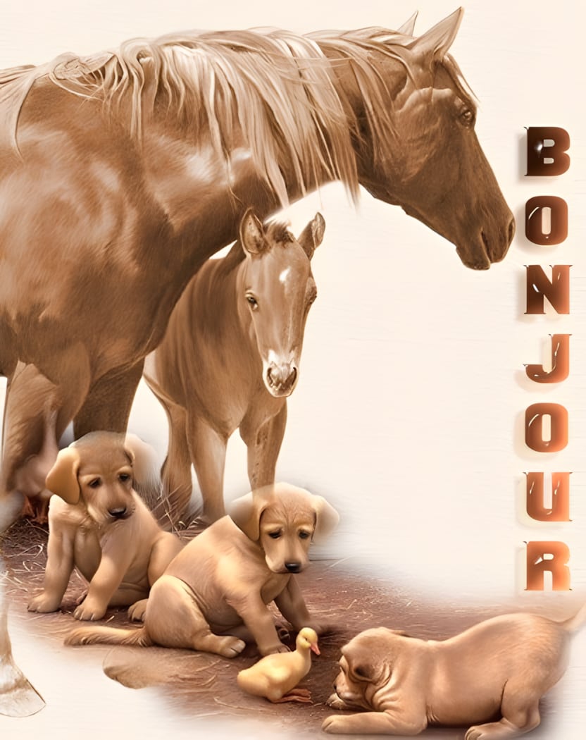 Matin de tendresse à la... Matin de tendresse à la ferme, où poulains, chiots et caneton partagent la douceur d’un premier jour rayonnant. Link: Code HTML: BBCode: Plus d'images de Bonjour ‹ Précédent Image Suivant › Images Similaires