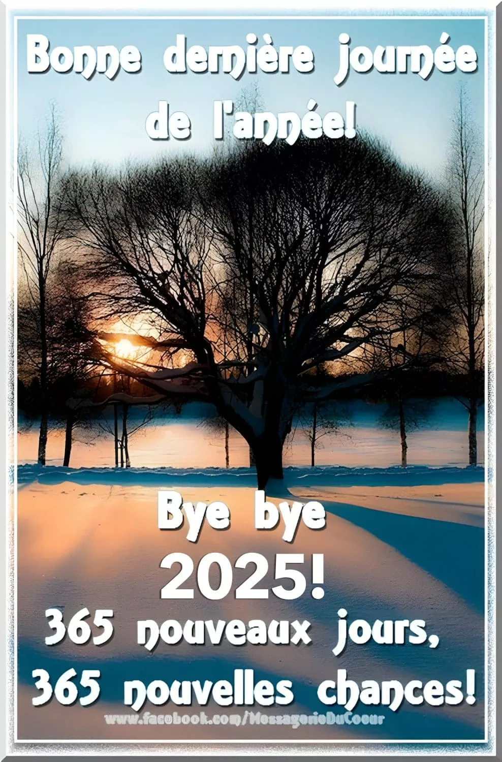 Le soleil couchant sur un... Bonne dernière journée de l'année ! Bye bye 2025 ! 365 nouveaux jours, 365 nouvelles chances ! Link: Code HTML: BBCode: Plus d'images de Dernier jour de l'année Images Similaires